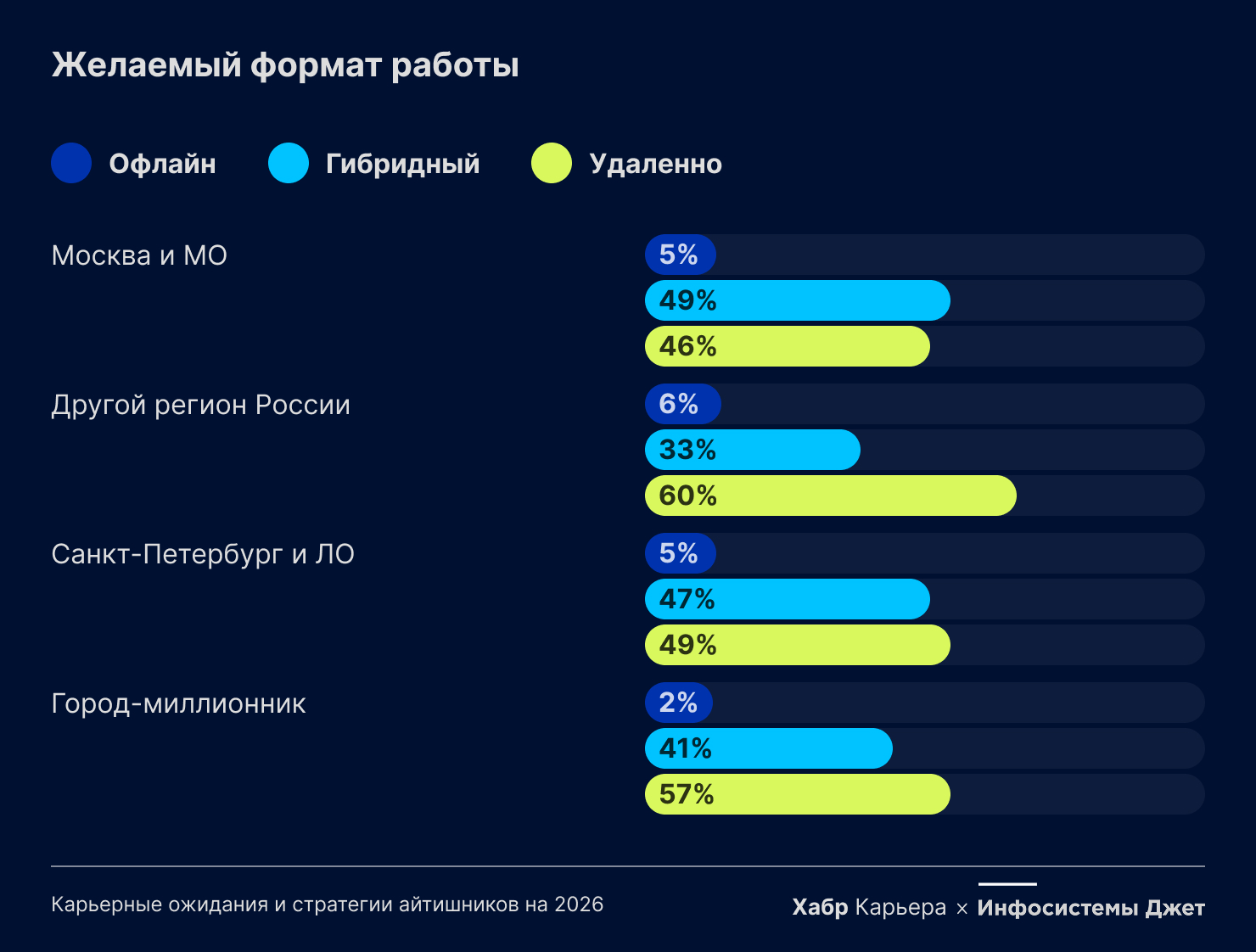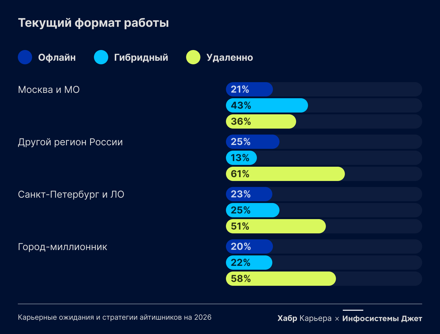 На фоне новостей о возвращении сотрудников в офисы в западных компаниях российский рынок выглядит стабильнее с точки зрения гибких форматов занятости. Почти половина опрошенных работают удаленно, около 20% сейчас работают из офиса, но на самом деле работать офлайн хотели бы лишь 5% специалистов. Гибридный формат особенно популярен в Москве и Московской области, тогда как в регионах преобладает удаленка.