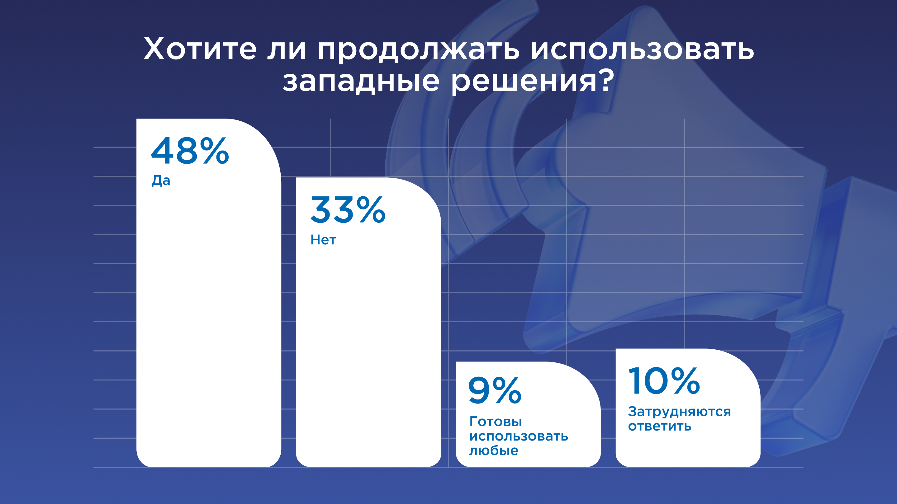 В условиях возможных ограничений на использование иностранных решений для звонков отечественные корпоративные платформы с аудио- и видеосвязью становятся еще более значимыми для бизнеса. Несмотря на вопросы к зрелости российских решений, ситуация на рынке заставляет бизнес как как минимум планировать изменения: 43% респондентов уже находятся в процессе миграции на российские решения, а ещё 28% рассматривают возможность их внедрения.